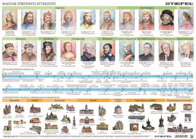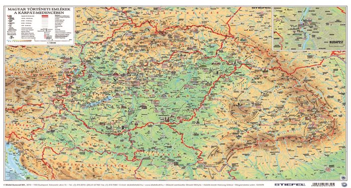 A térkép a magyar történelmi emlékhelyeket és a magyar nemzeti kincseket veszi számba. A Kárpát-medence legismertebb látványosságait színes akvarell rajzok elevenítik meg. A negyvennyolcas és a Rákóczi-szabadságharc emlékhelyeit is bemutató térkép a jelentős búcsújáróhelyeket, templomokat piktogrammal ábrázolja. A jelenlegi közép-európai országhatárok mellett vékonyabb vonallal feltüntettük a történelmi Magyarország határát is.