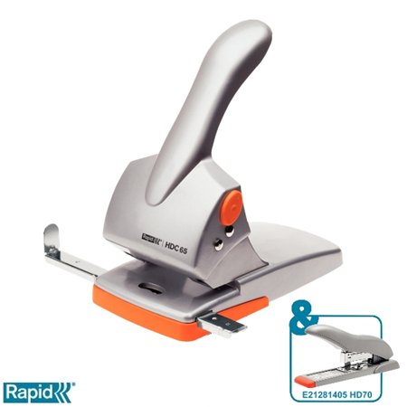 Lyukasztó, nagyteljesítményű, kétlyukú, 65 lap, RAPID "HDC65 Fashion", ezüst/narancssárga