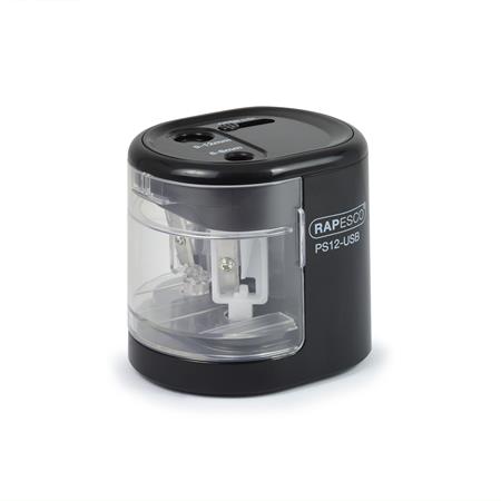 Hegyező, kétlyukú, asztali, elemes, USB töltővel, RAPESCO"PS12-USB", fekete