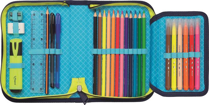 Töltött tolltartó divatos mintával, amely minden szükséges írószert tartalmaz a tanórákhoz. Praktikus kialakításának köszönhetően a ceruzák, radírok, ollók és egyéb eszközök átláthatóan rendszerezhetők benne.