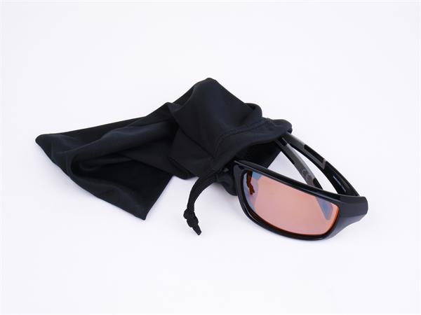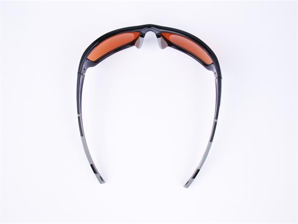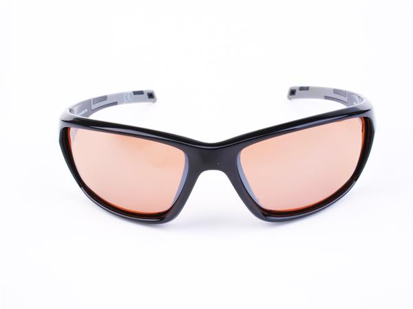 Sportnapszemüveg borostyánszínű HD lencsével, fekete műanyag kerettel.
