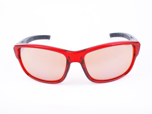 Sportnapszemüveg borostyánszínű HD lencsével, meggypiros-fekete műanyag kerettel.